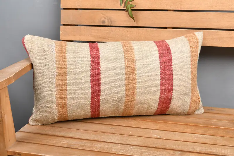 Almohada de tiro a rayas beige y marrón, almohada de lino bordada 12x24