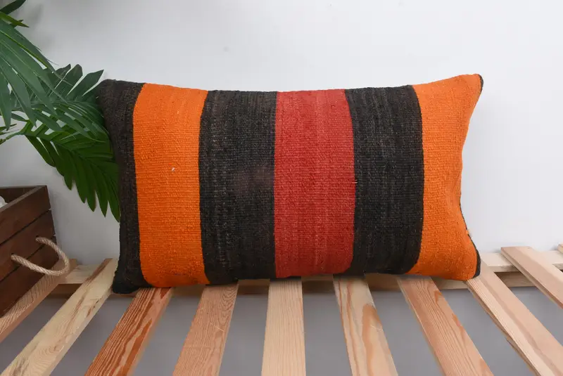 Almohada de tiro a rayas naranja y negra, cojín de lino hecho a mano de 12x20