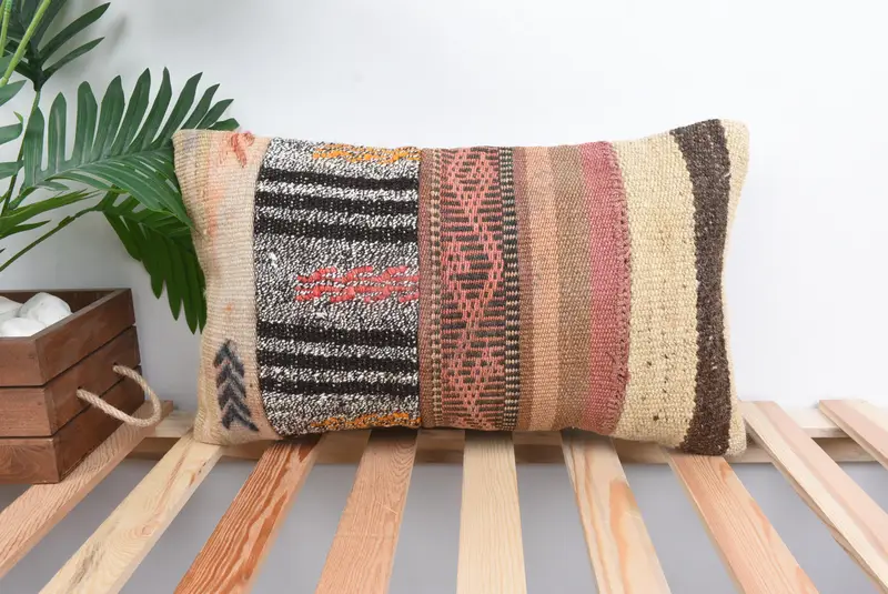 Almohada de patchwork marrón y beige bordada, almohada de lanzamiento hecha a mano de 12x20