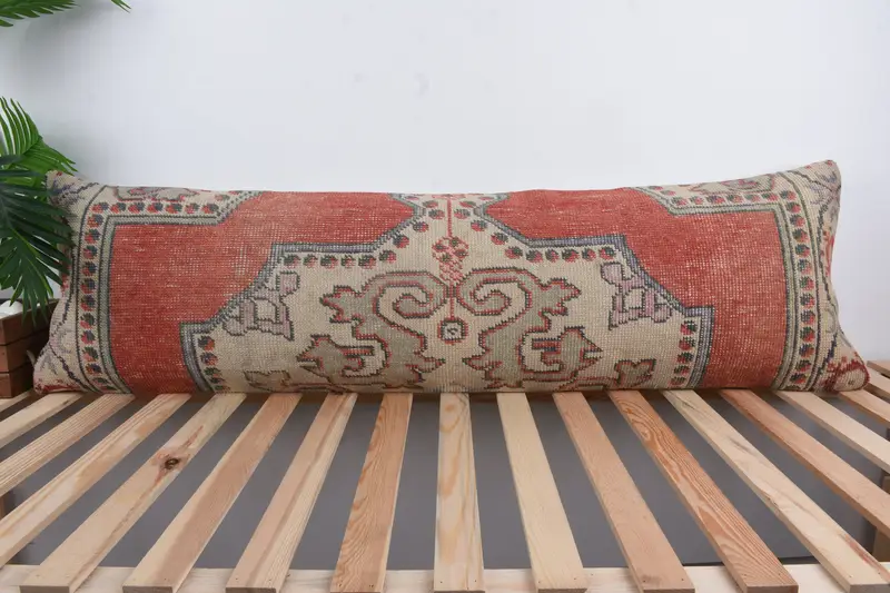 Almohada de tiro bordada roja y beige, almohada rectangular floral vintage