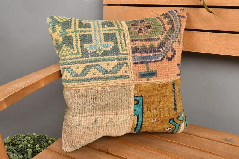 Almohada de lanzamiento de patchwork marrón y verde, cojín bordado 14x14
