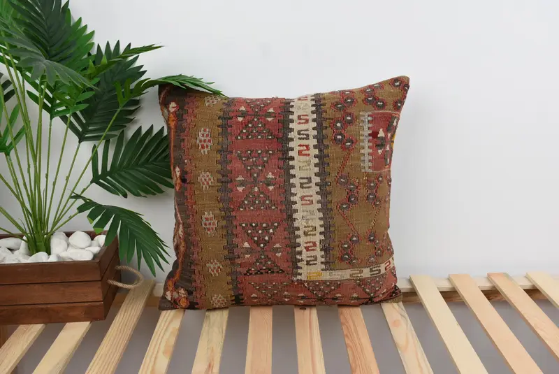 Almohada de tiro bordada marrón y roja, almohada geométrica hecha a mano de 20x20