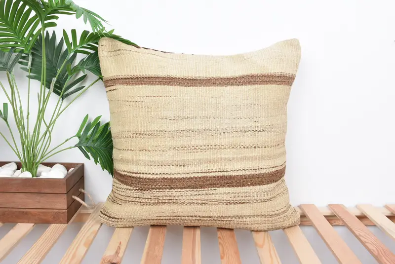 Almohada de tiro a rayas beige y marrón, cojín bordado vintage