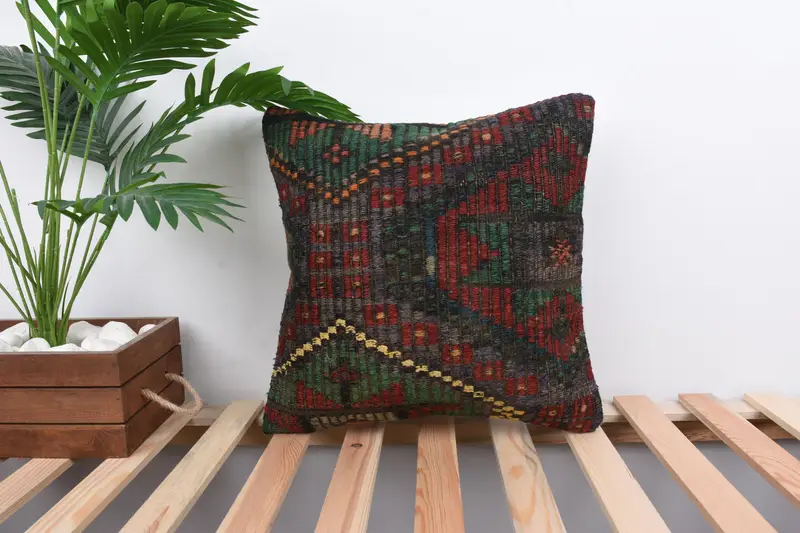 Almohada de lanzamiento verde y rojo bordada hecha a mano, cojín geométrico vintage