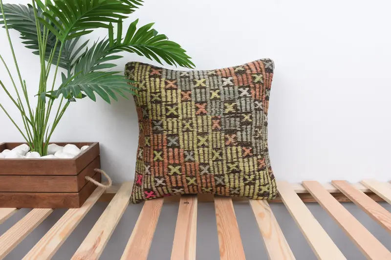 Almohada de lanzamiento geométrico verde y gris tejida a mano, cojín de lino vintage