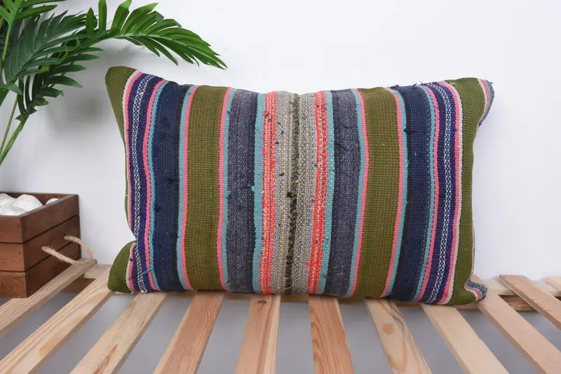 Almohada de tiro Kilim a rayas verdes y bronce, cojín rectangular hecho a mano