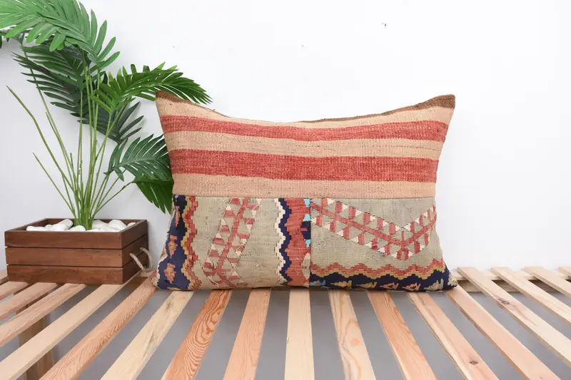 Almohada de lanzamiento de patchwork rojo y beige, cojín hecho a mano de 20x28