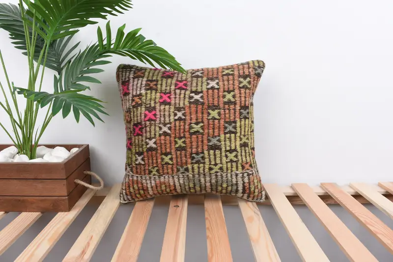 Almohada de tiro bordada naranja y verde, cojín geométrico vintage
