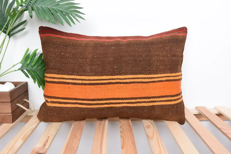 Almohada de tiro a rayas marrón y naranja, almohada bordada vintage