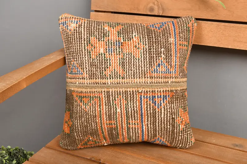 Almohada de lanzamiento de patchwork marrón y naranja bordada, cojín vintage hecho a mano