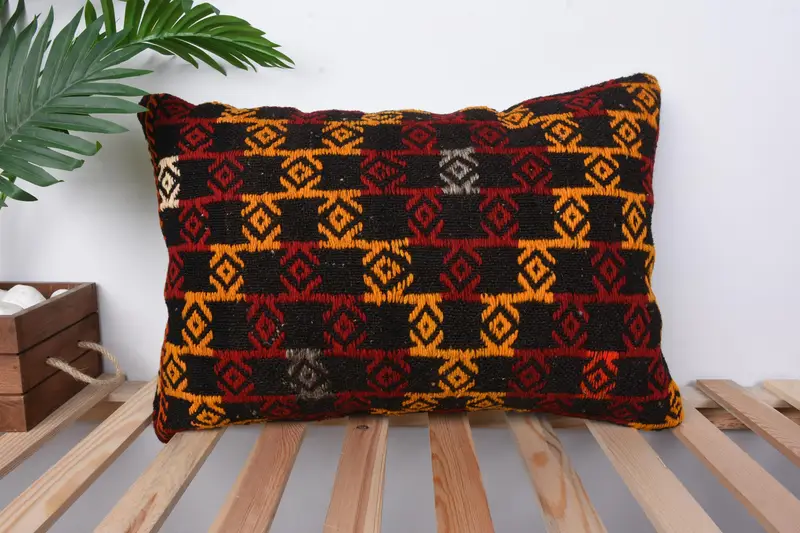 Almohada de tiro bordada marrón y naranja, cojín geométrico hecho a mano