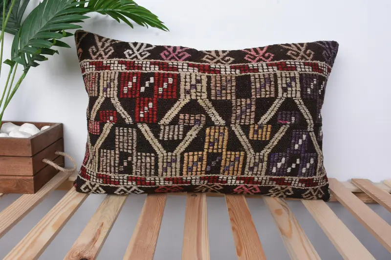 Almohada de lino marrón con patrón geométrico, almohada de lanzamiento bordada de 16x24
