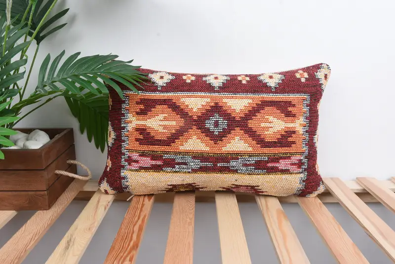 Almohada de tiro bordada roja y naranja, almohada geométrica vintage