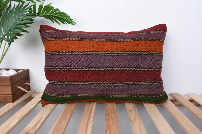 Almohada de tiro de lino a rayas hecha a mano, cojín bordado vintage