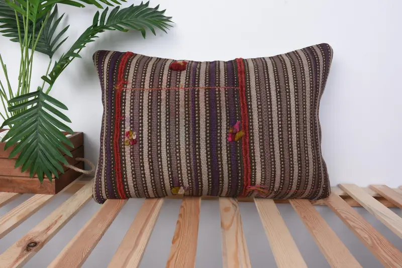 Almohada de tiro de rayas marrones y rojas, cojín bordado vintage