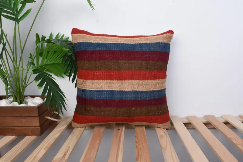 Almohada de tiro a rayas rojas y beige, cojín bordado vintage
