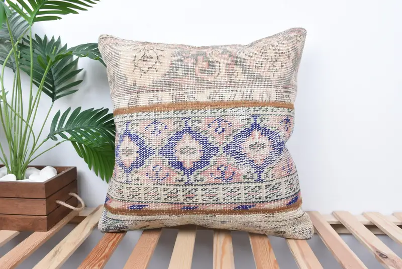 Almohada de lanzamiento de patchwork azul y beige hecha a mano, cojín bordado 22x22