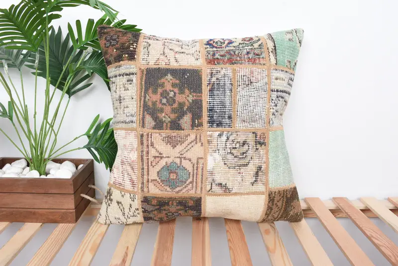 Almohada de lanzamiento de patchwork beige y marrón, cojín vintage bordado de 22x22