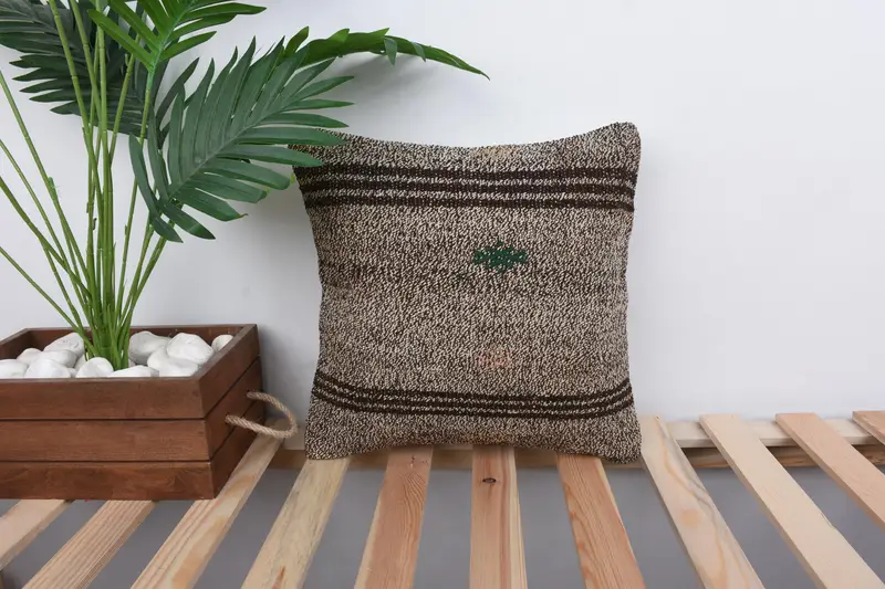 Almohada de rayas marrón y blanca bordada hecha a mano, almohada de tiro versátil