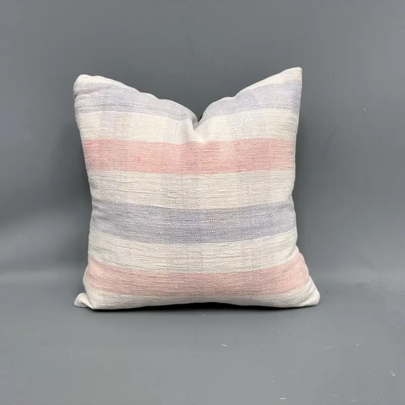 Almohada de tiro Kilim tejida a mano, almohada de lino rosa y gris a rayas