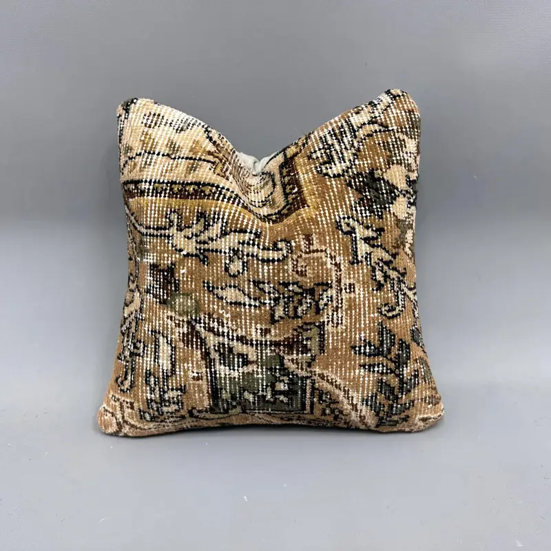 Almohada de lanzamiento floral beige y verde hecha a mano, cojín de lino vintage