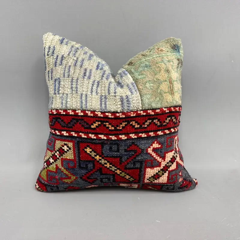 Almohada de lanzamiento de patchwork beige y verde, cojín Kilim vintage