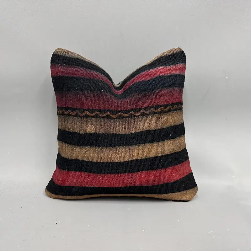 Almohada de tiro a rayas rojas y beige, almohada Kilim vintage hecha a mano