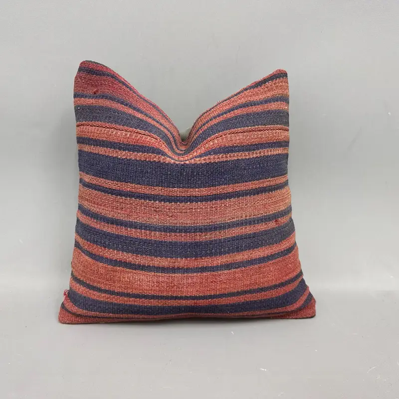 Almohada de tiro Kilim de rayas rojas, cojín bordado vintage
