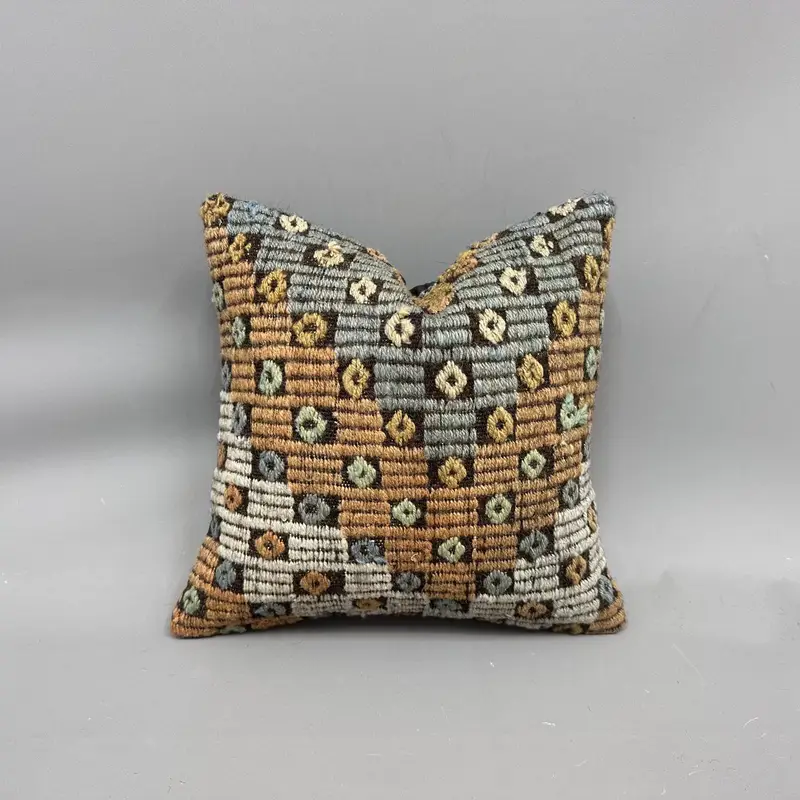 Almohada de tiro bordada naranja y gris, almohada Kilim vintage