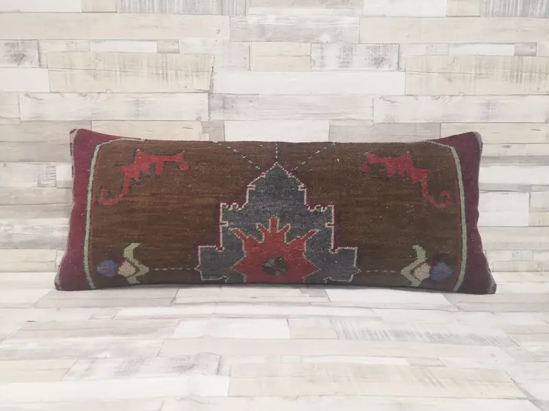 Almohada de lanzamiento de lana hecha a mano, almohada rectangular geométrica azul y marrón