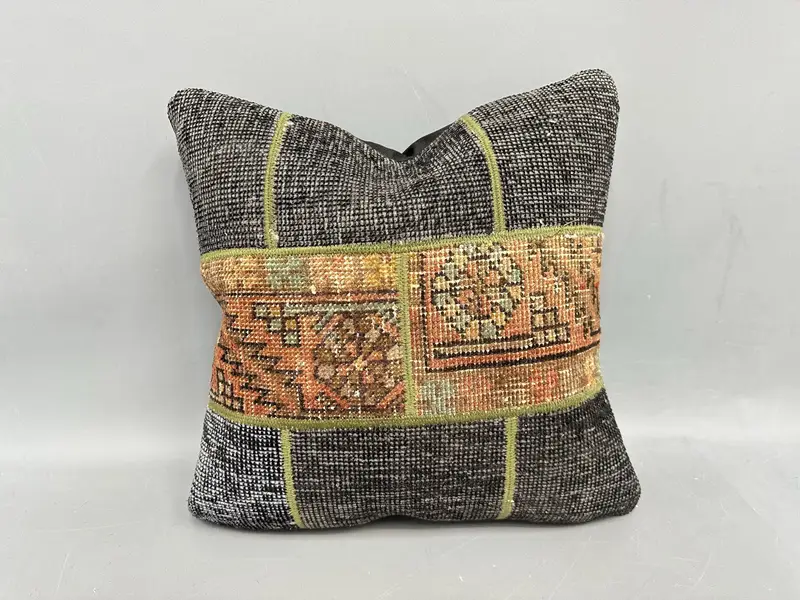 Almohada de lanzamiento de patchwork negro y marrón, cojín bordado vintage
