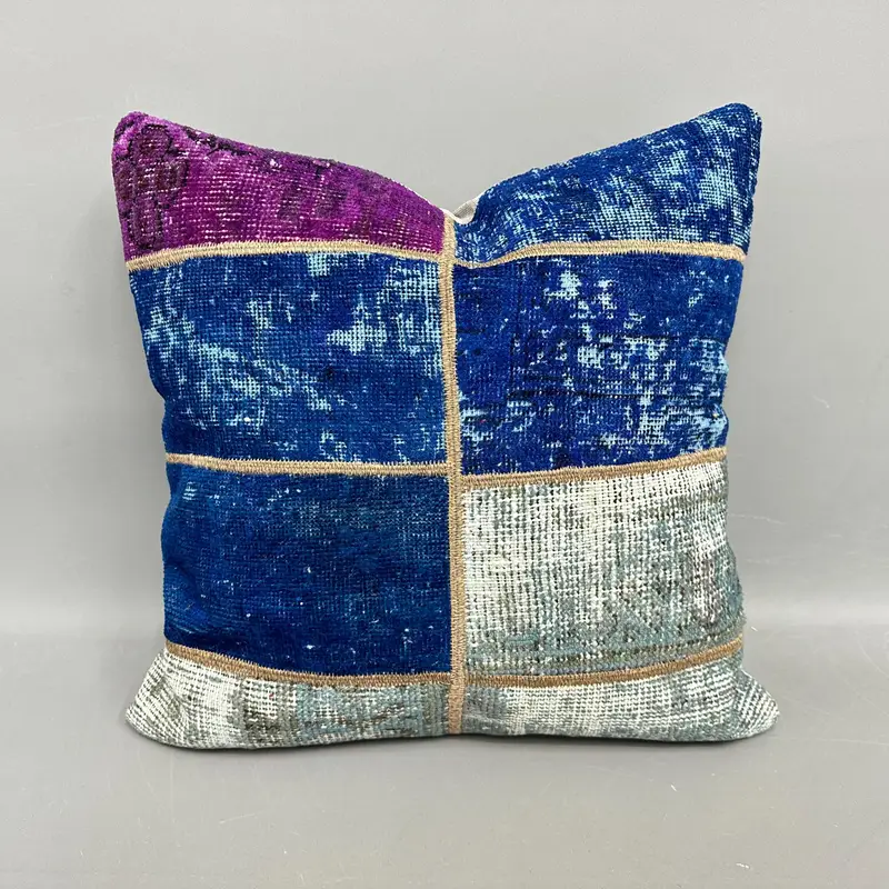 Almohada de lanzamiento de patchwork azul y gris, cojín Kilim vintage