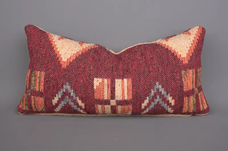 Almohada de tiro bordada en rojo y naranja, almohada de lino geométrica hecha a mano