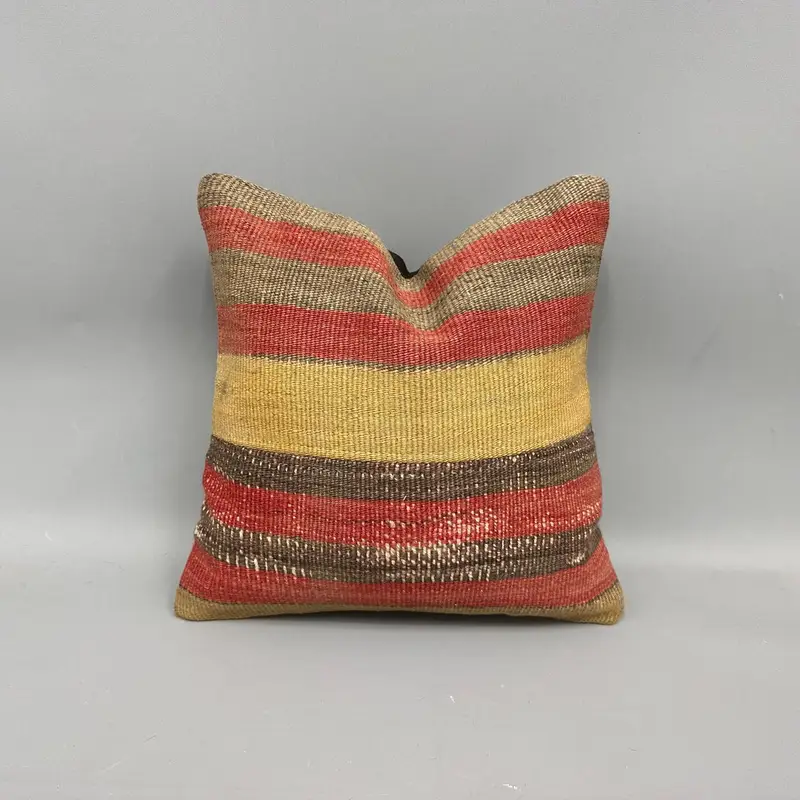 Almohada de tiro a rayas rojas y marrones, cojín vintage hecho a mano