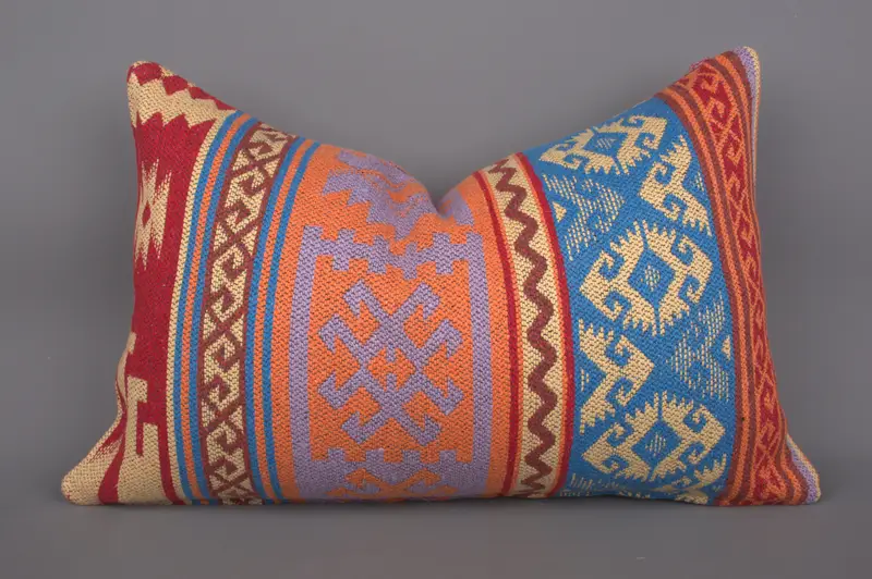 Almohada de lanzamiento geométrico rojo y naranja, cojín Kilim vintage hecho a mano
