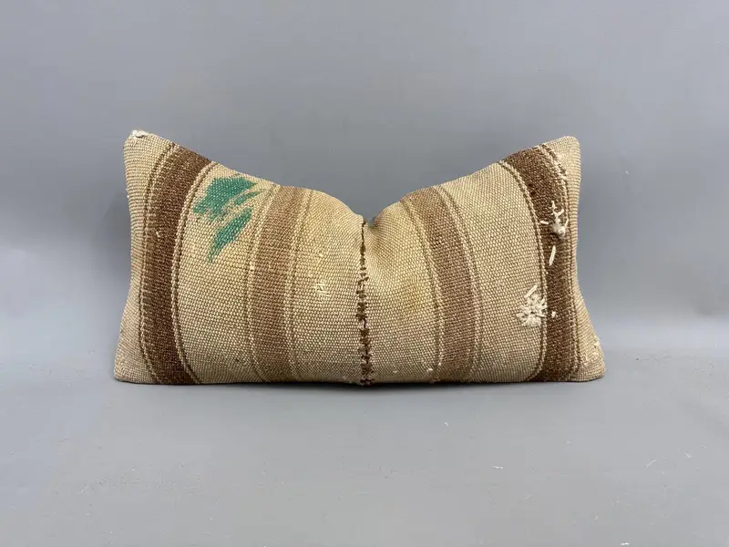 Almohada de tiro Kilim beige y marrón hecha a mano, cojín de patchwork vintage de 12x24 pulgadas