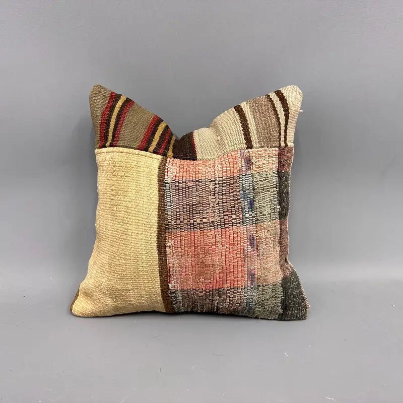 Almohada de tiro Kilim a rayas beige y marrón, cojín étnico vintage