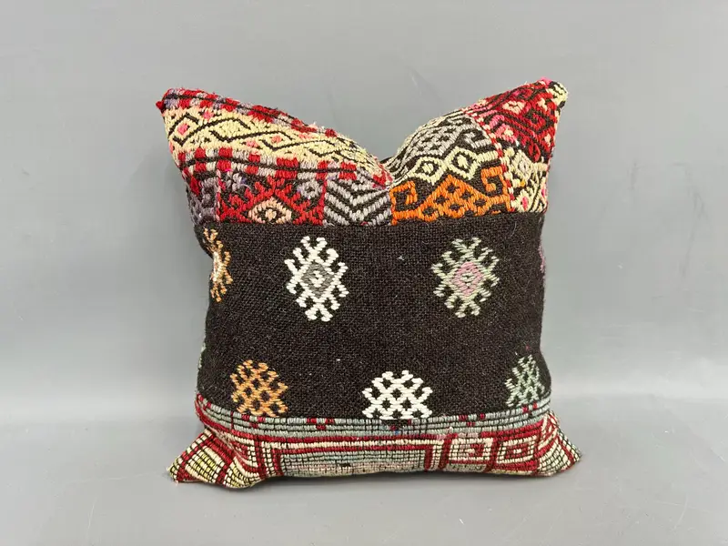 Almohada de lanzamiento Kilim de patchwork marrón y beige, cojín bordado vintage