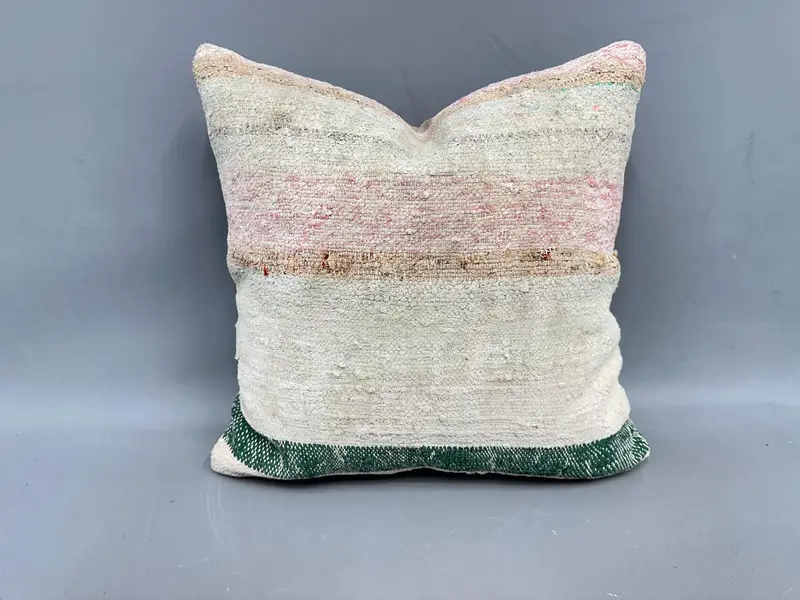 Almohada de tiro a rayas beige y verde, cojín bordado vintage