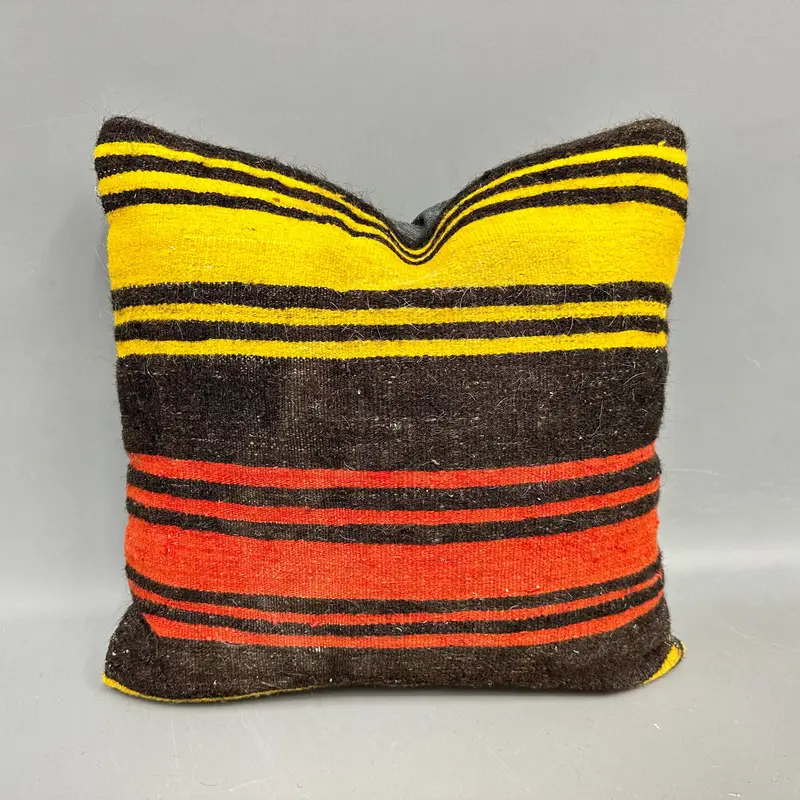 Almohada de tiro a rayas marrón y naranja, cojín bordado vintage