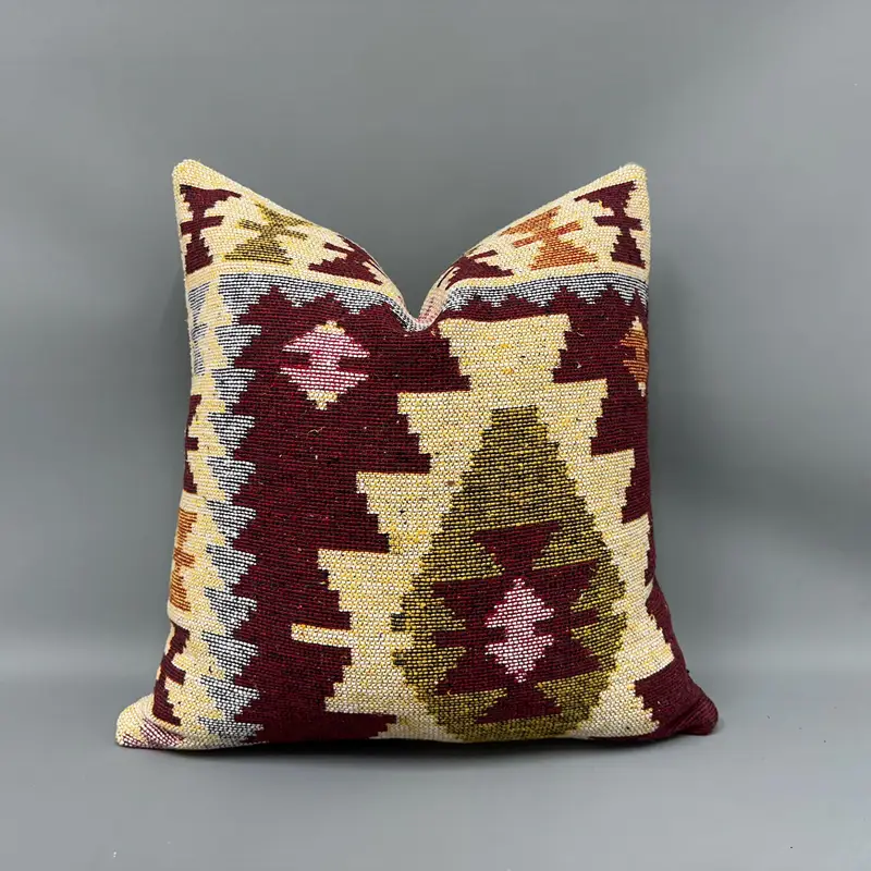 Almohada de tiro kilim geométrica roja, cojín vintage hecho a mano