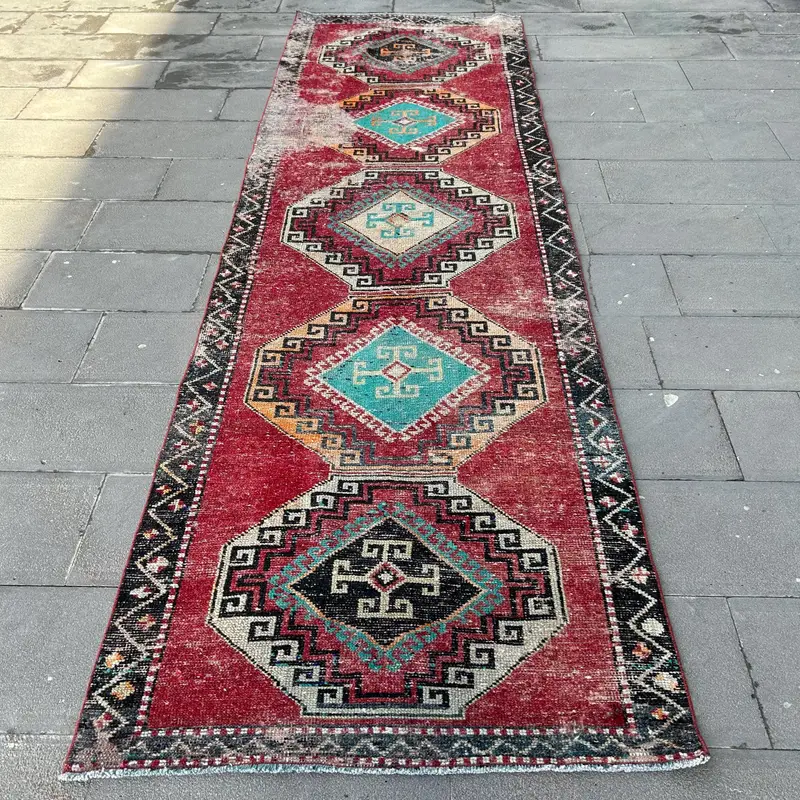 Elegante alfombra roja y verde, 3,6x12 pies floral y geométrica