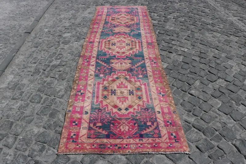 Elegante alfombra oriental rosa y azul, decoración elegante de 3,3 x 11 pies