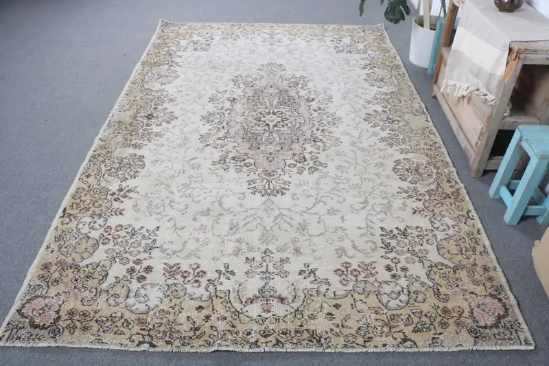 Alfombra elegante beige 1,8x2,5m con motivos vegetales amarillos