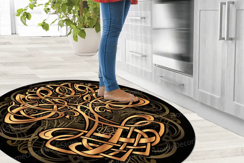 Alfombra estampada abstracta con círculos dorados y negros - Acento moderno para el hogar