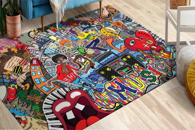 Alfombra colorida con estampado de grafitis: decoración moderna inspirada en la música
