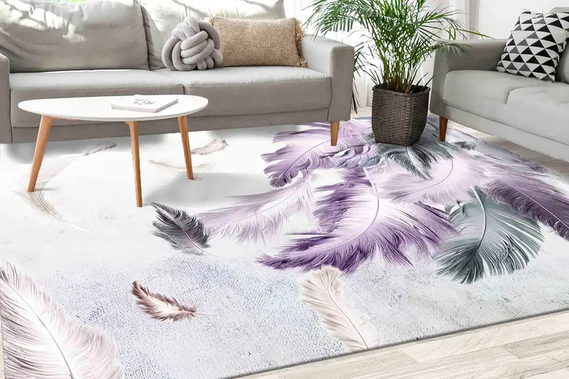 Alfombra estampada contemporánea morada con motivos de plumas en tonos suaves
