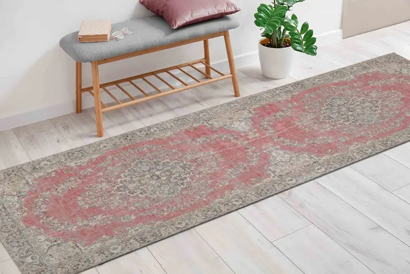 Alfombra Oushak con estampado floral y medallones en tonos suaves en rojo y gris