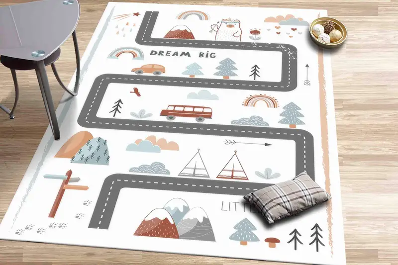 Alfombra estampada con paisaje urbano para niños, diseño vibrante de carreteras y coches
