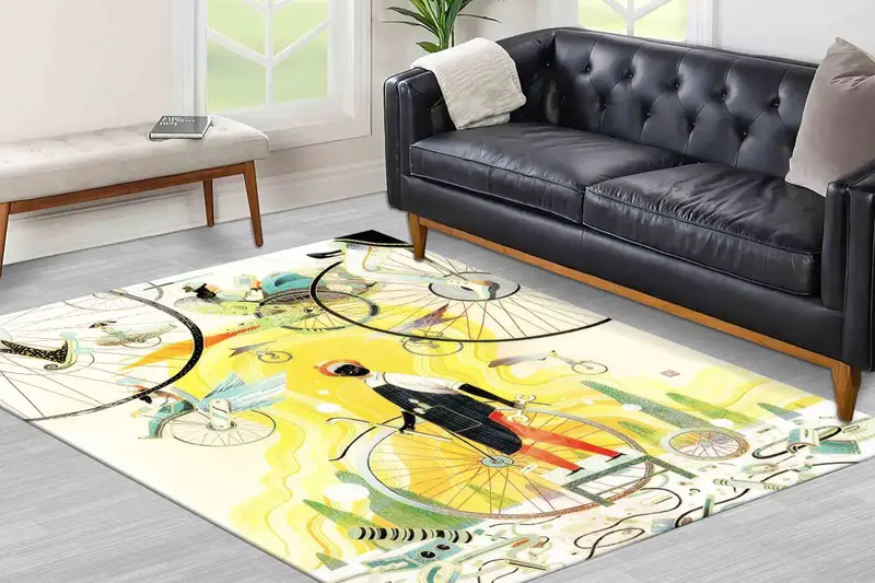 Alfombra estampada moderna con bicicleta abstracta amarilla, diseño minimalista